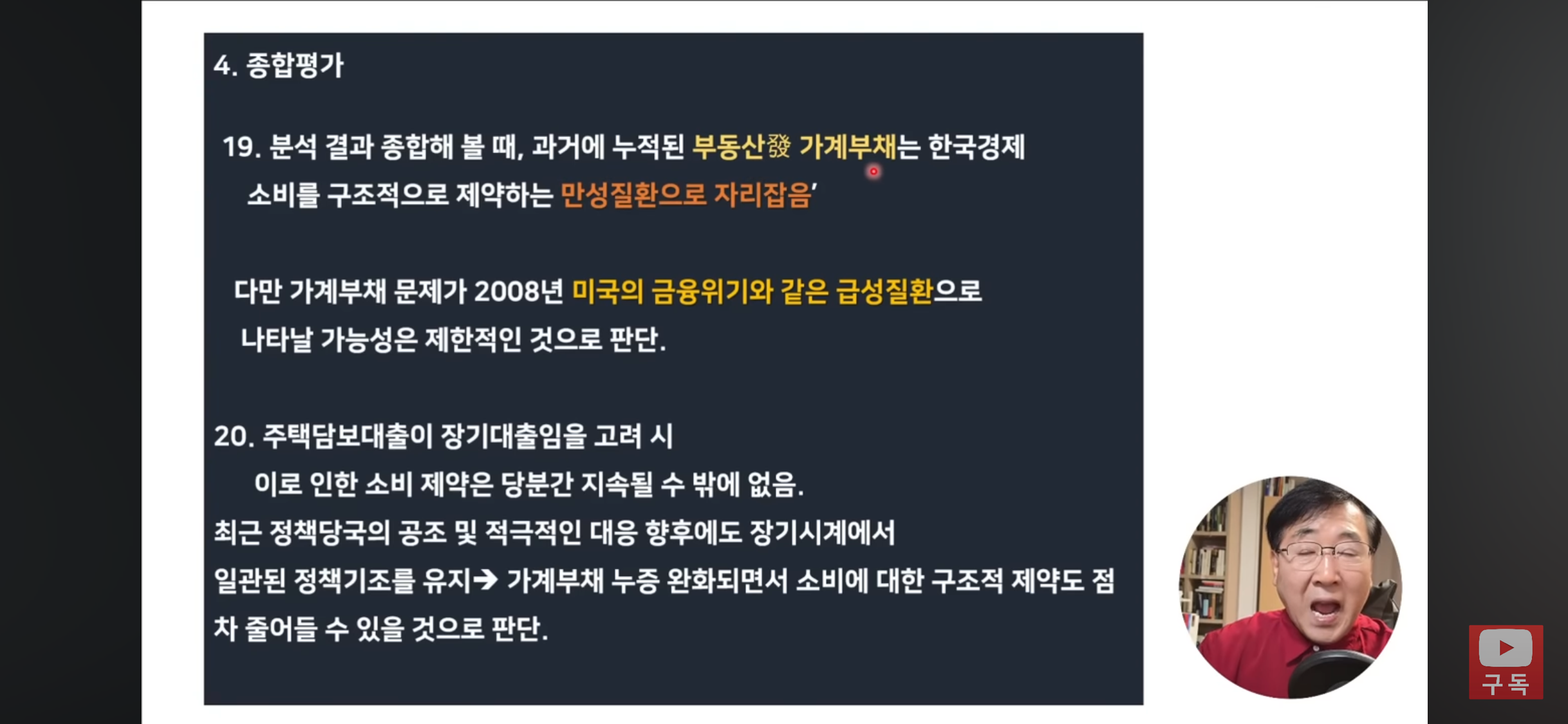 * 보고서 종합 평가 [07:36]: 누적된 부동산발 가계부채는 한국 경제 소비를 구조적으로 제약하는 **'만성 질환'**으로 자리 잡았으며, 당분간 소비 제약은 지속될 수밖에 없으므로 정부의 일관된 대출 규제 정책이 필요하다고 강조합니다.