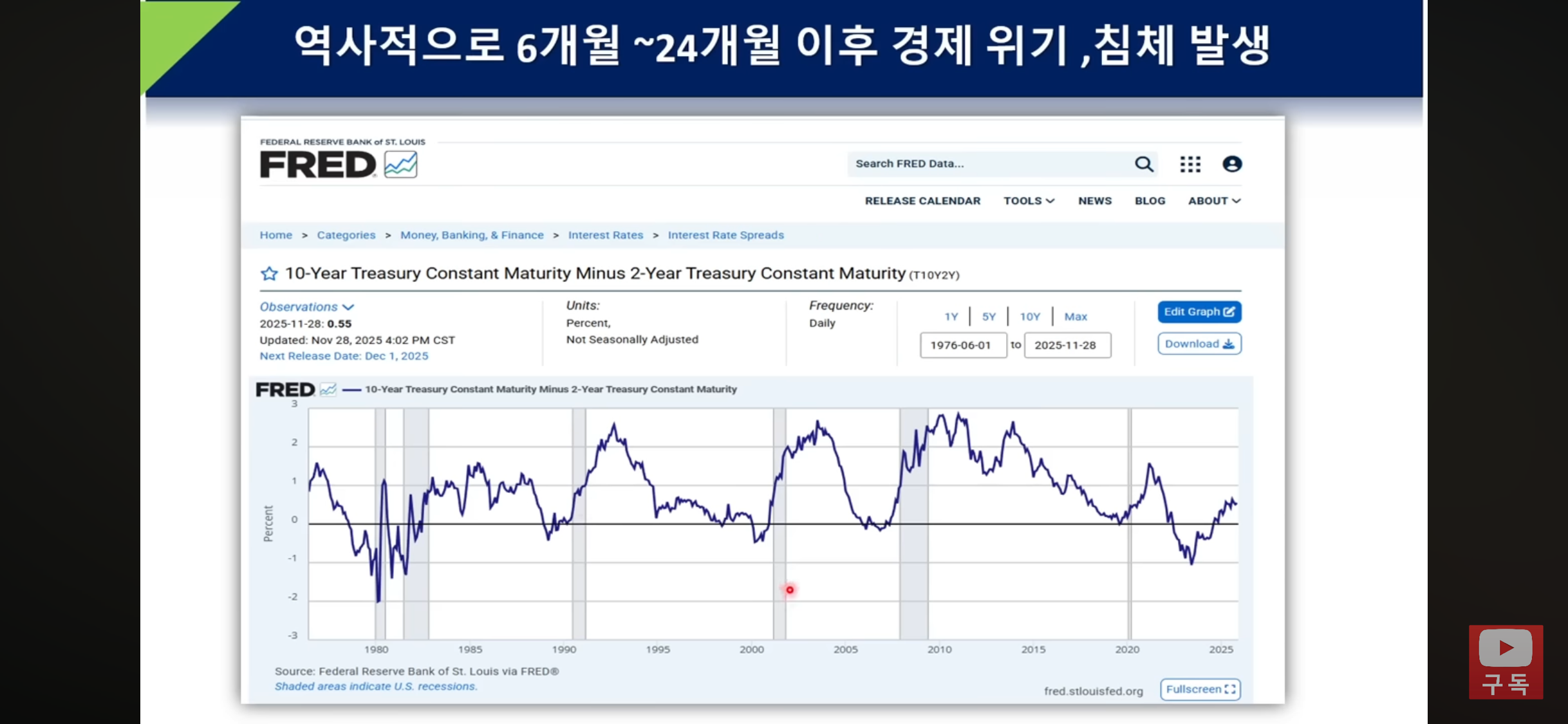 * 장단기 금리 역전 [16:04]: 과거 사례를 볼 때, 장단기 금리 역전 현상 이후 어김없이 경제 침체나 위기가 찾아왔습니다. 현재도 역전 상태가 길게 이어지고 있어, 2026년 또는 2027년 경에 리스크가 발발할 가능성이 높다고 예측합니다.
