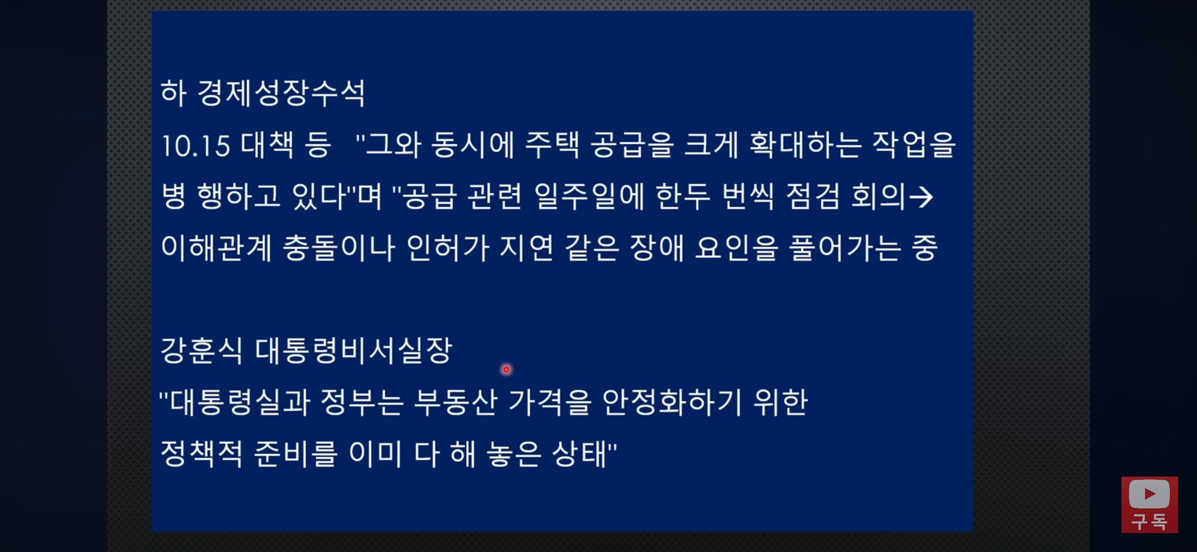 * 진화 내용: 대통령실 비서실장 등은 11.11 대책 등 여러 정책을 추진 중이며, 주택 공급 확대 작업도 병행하고 있다고 설명했습니다 [06:17]. 또한 대통령의 발언은 지방 균형 발전이라는 목적과 취지에 초점을 둔 것이라고 해명했습니다 [06:29].